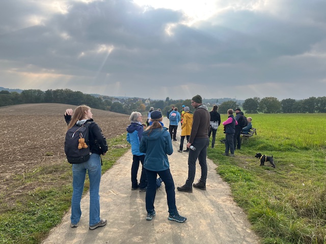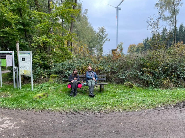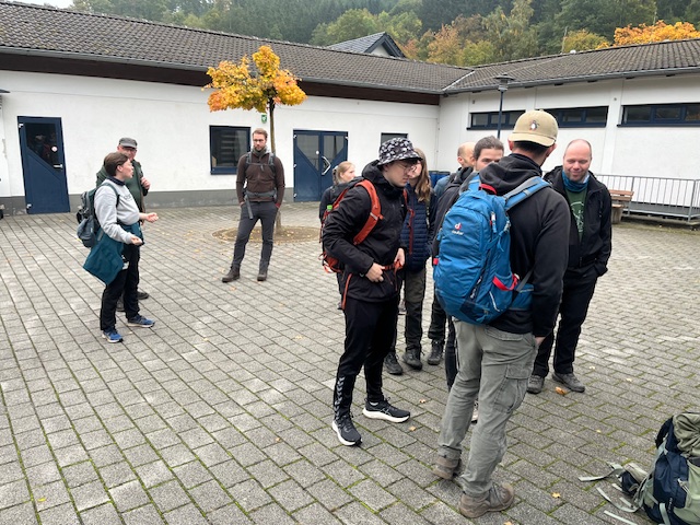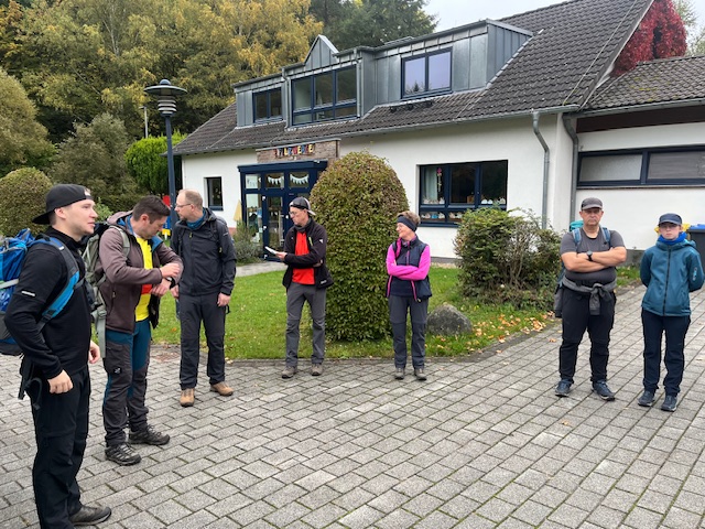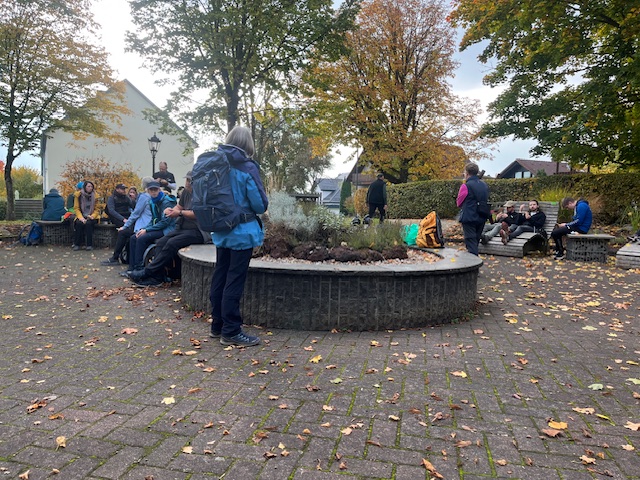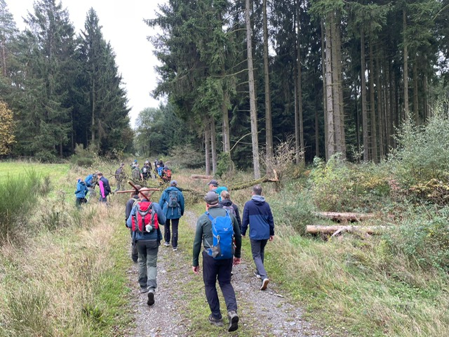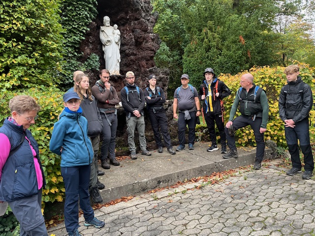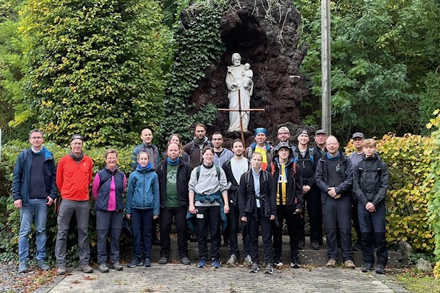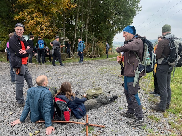 Der Sonntag begann früh: Um 7 Uhr klingelten die Wecker in Leimbach. Nach einem stärkenden Frühstück wurden die Busse beladen, die Rucksäcke geschultert und die Wanderschuhe geschnürt. Bei trockenem Herbstwetter startete die Pilgergruppe um 8:45 Uhr in Richtung Adenau und wanderte vorbei an der Nürburg und dem gleichnamigen Ring bis zum ADAC-Fahrsicherheitszentrum, wo die erste größere Pause eingelegt wurde.